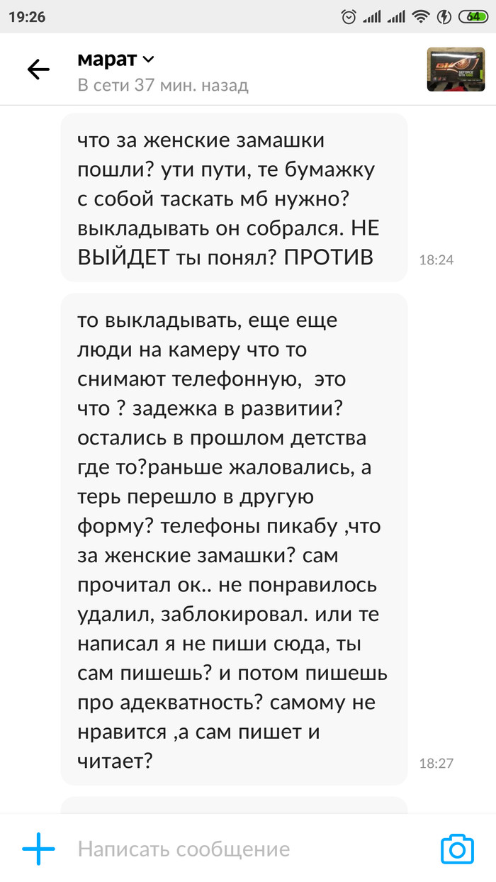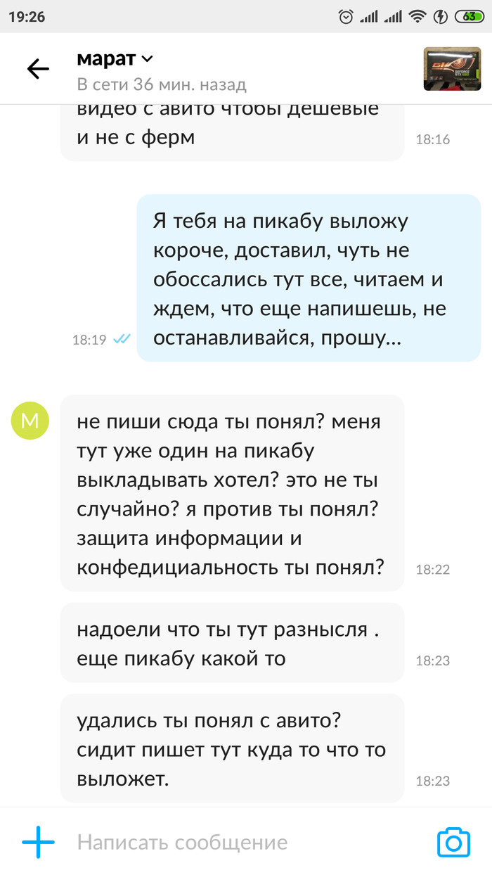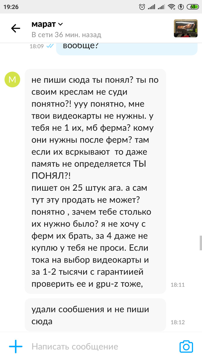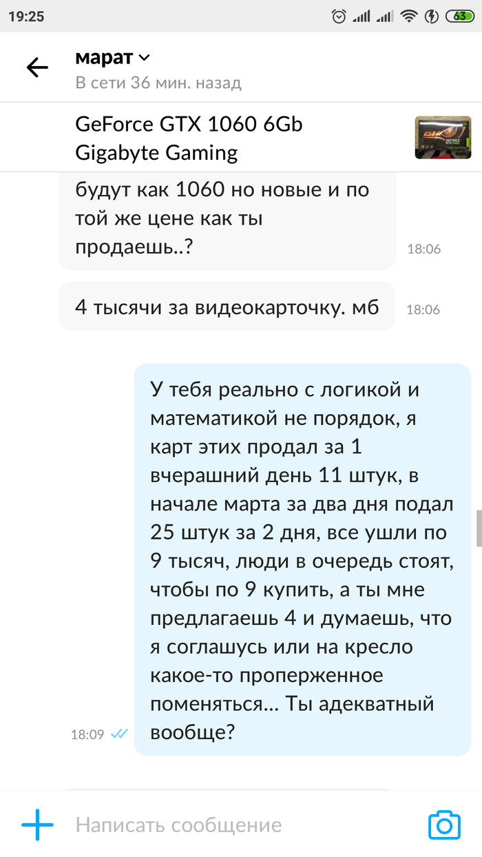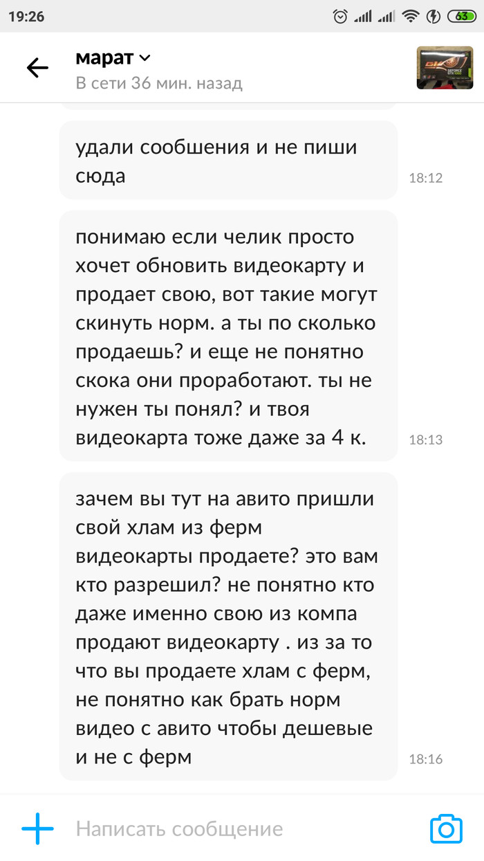 86 bingosales Неадекват с Авито 6 лет назад Продавал на всем известном сайте видеокарты с майнинговых ферм, осталась последняя и появился он... Один только вопрос: как они вообще живут эти люди?? Показать полностью 10 [моё] Неадекват Авито Длиннопост Скриншот