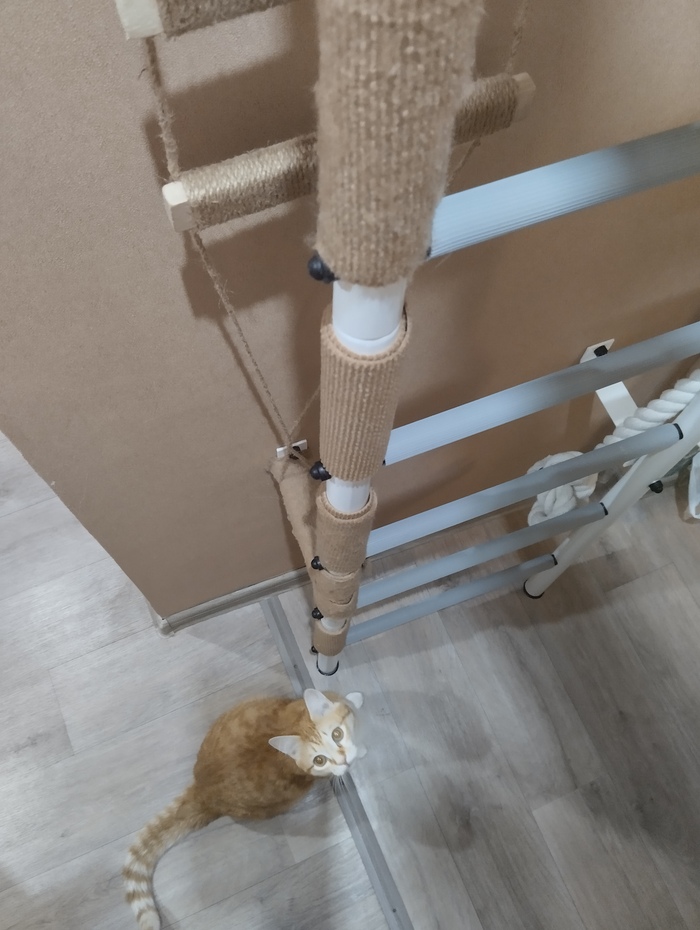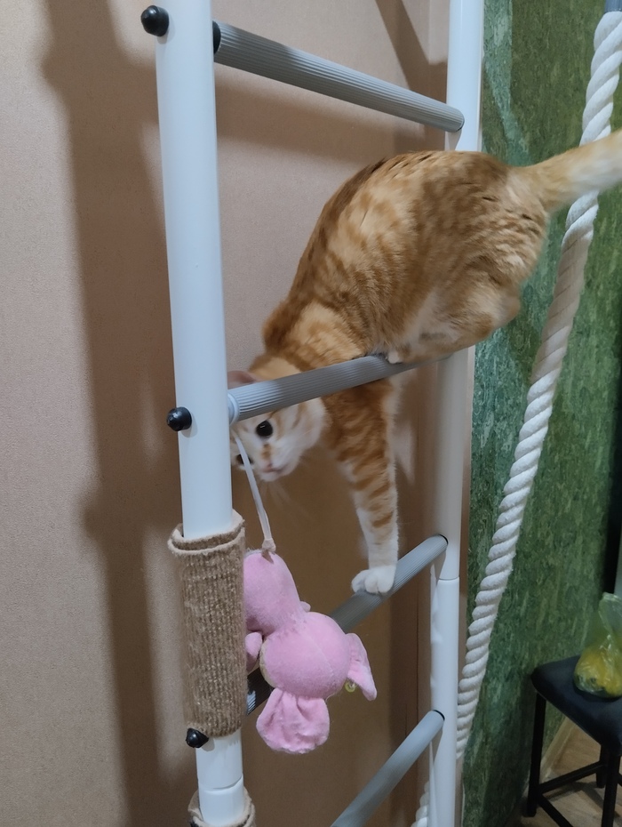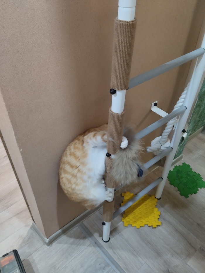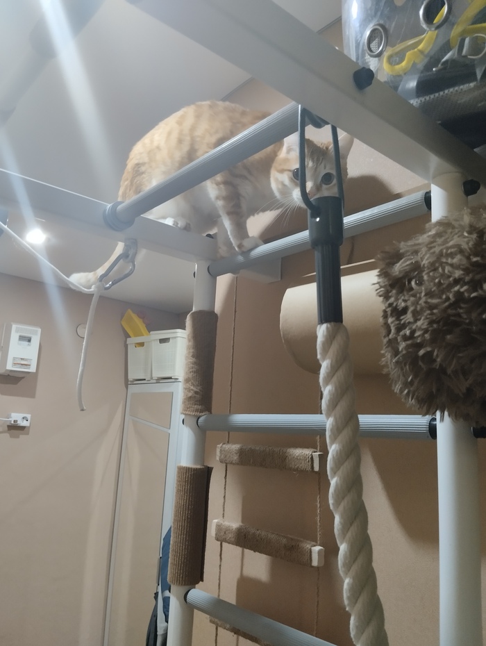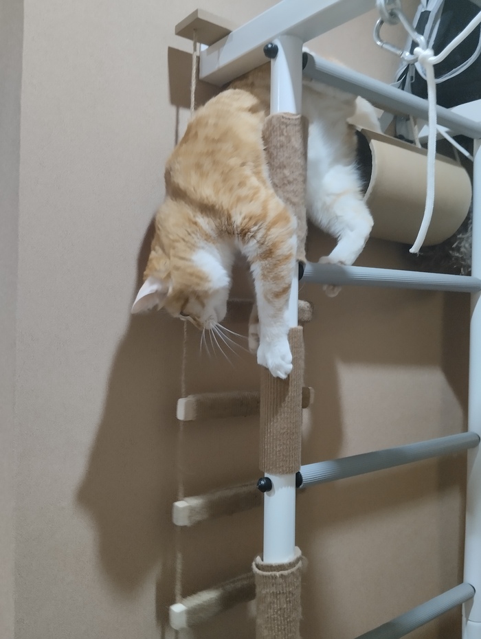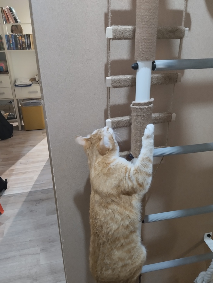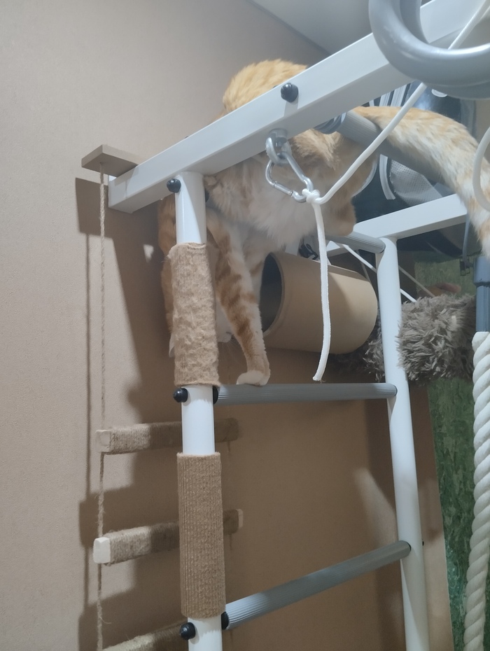 Через неделю кот уже уверенно залазил по когтеточкам, и даже начал использовать горизонтальные перекладины. Со временем научился держать на них равновесие и стал залазить выше — туда, где ещё нет когтеточек.