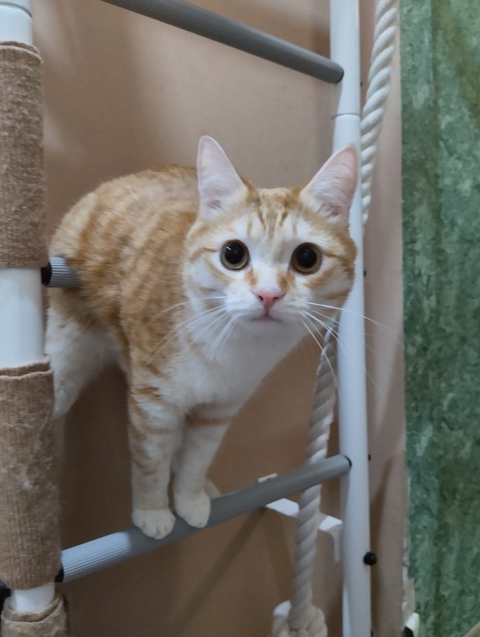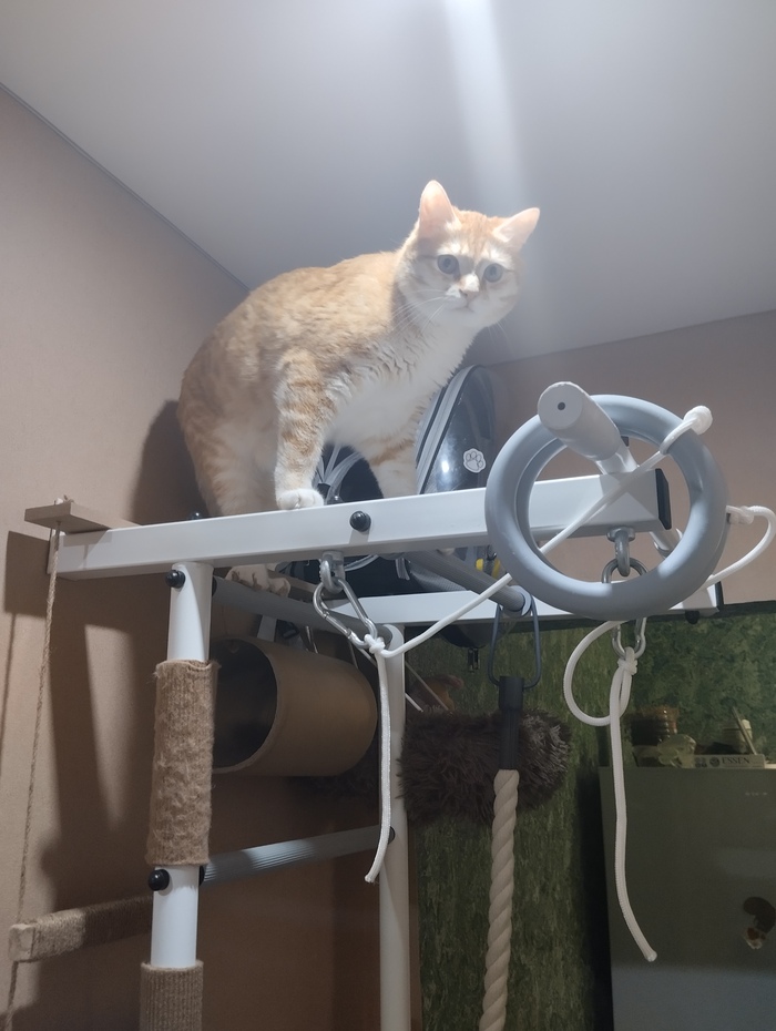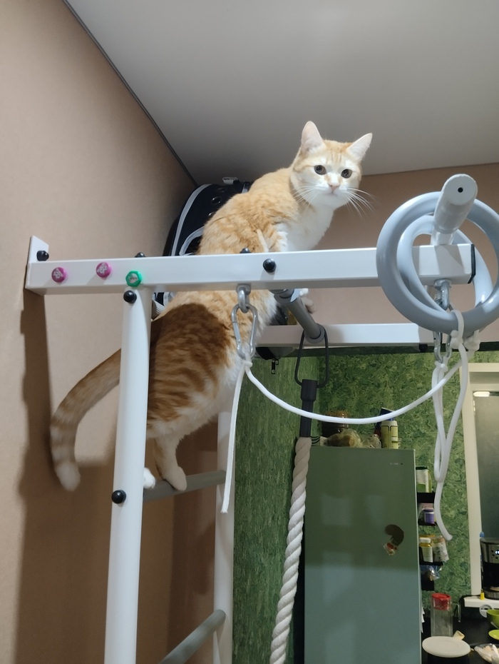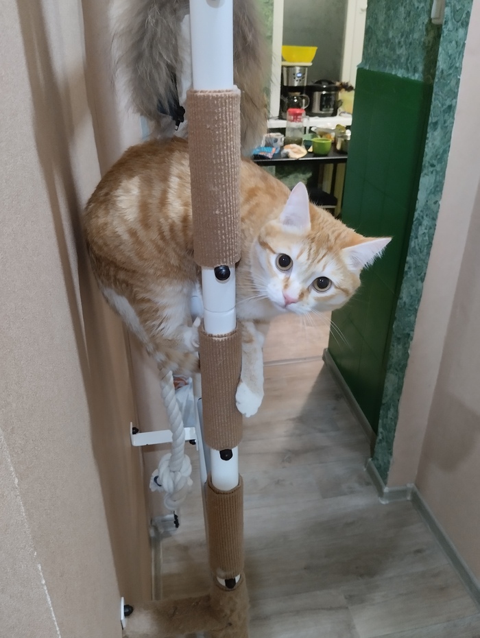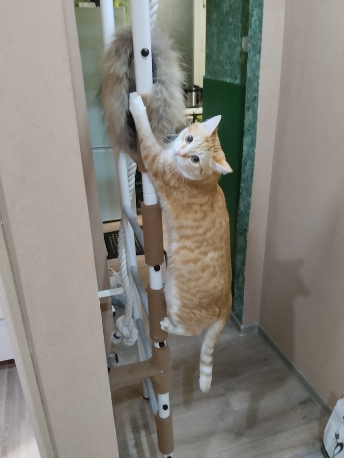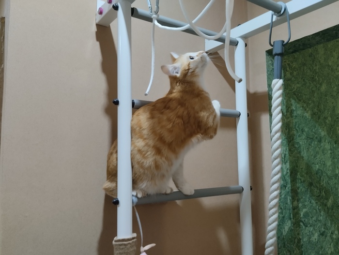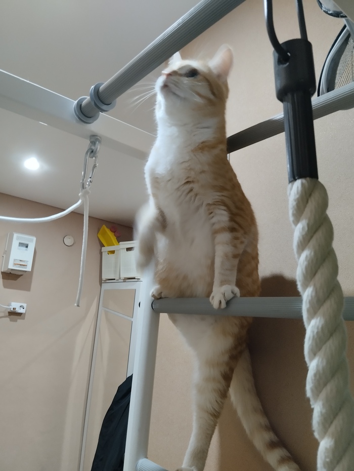 Через неделю кот уже уверенно залазил по когтеточкам, и даже начал использовать горизонтальные перекладины. Со временем научился держать на них равновесие и стал залазить выше — туда, где ещё нет когтеточек.