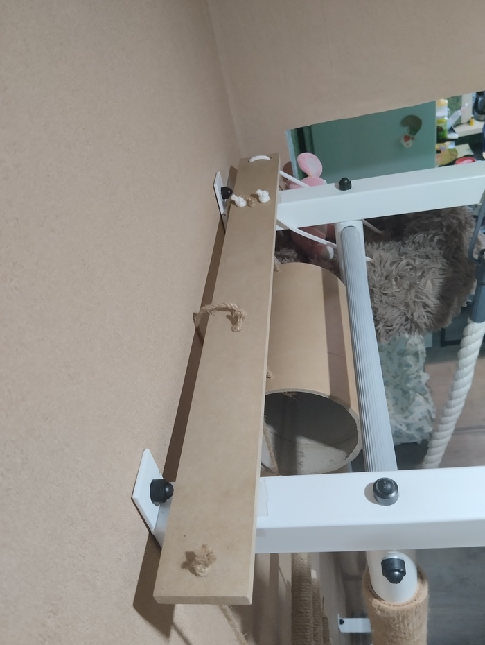 В основу всей конструкции пошла МДФ-ная перекладина, в которой я просверлил 8 дырок и собрал всё на верёвках. На крепление трубы пошли обрезки верёвки от кошачей лестницы. Для лежанки сделал жёсткое дно из ДВП-шки и собрал на 4 точки цельным куском верёвки. Когтеточки сделал уже на всю высоту.