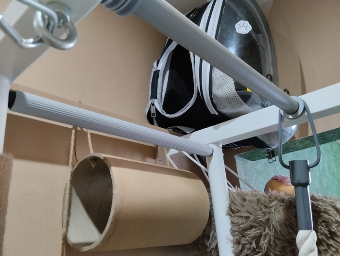 Спустя ещё пару недель я насобирал оставшиеся детали и додумал основной концепт. Докупил специальную лестницу для домашних животных и мягкую лежанку. Из хлама и остатков в дело пошли кусок МДФ, кусок ДВП, картонная труба (сердцевина катушки кабеля) и примерно полтора метра верёвки из комплекта шведской стенки.