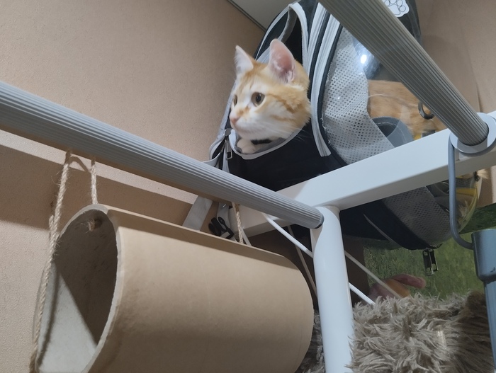 Кот постепенно адаптировался. Поначалу он боялся даже этой высоты. Пару раз падал. При этом валился мешком, а на морде было выражение полнейшего ужаса. Для заманухи повесили меховую опушку от капюшона. Любопытство взяло своё.