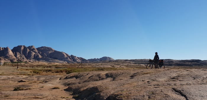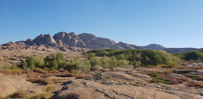 Выехали поближе рассмотреть Бектауата, к сожалению дрон не удалось запустить, дул сильный порывистый ветер. Немного почитав откуда же взялась посреди голой степи горная местность, выяснилось, что это выдавленные зарождавшимся вулканом породы, но вулкан так и не взорвался, и остались эти породы на растерзание ветру и дождю, именно они придали этой местности такие оплавленные формы, а не из-за того что это все некогда было лавой, узнал что гранит в принципе не плавится. Виды конечно завораживают, хотелось побродить подольше, необычное место, но в другой раз, сделали несколько фото с самой высокой горой, это 1200 м., набрали воды из колодца, пообщались с дружелюбными собакенами размером с велосипед и выдвинулись в путь.