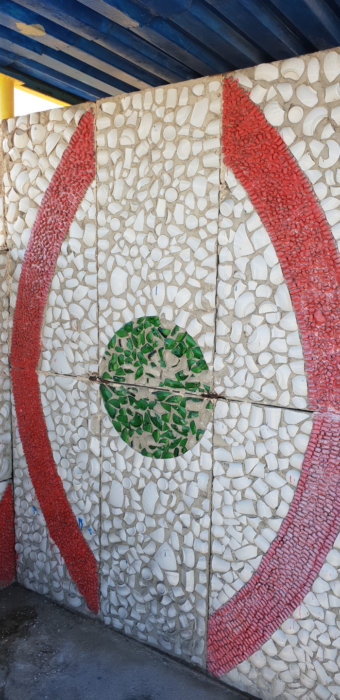 И снова в путь, заправились кофе на АЗС и нашли артефакт советских времен, автобусная остановка украшенная вместо плитки, битой посудой. Спустя 10 км. добрались до города, и еще один объект советской инженерии, здоровенный и крутой паровоз с диаметром колес ~1,5 м. собранный в 1955 г. Минтранасмашем на Ворошиловградском паровозостроительном заводе им. Октябрьской революции. Едем дальше.