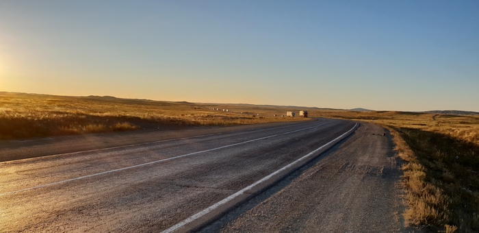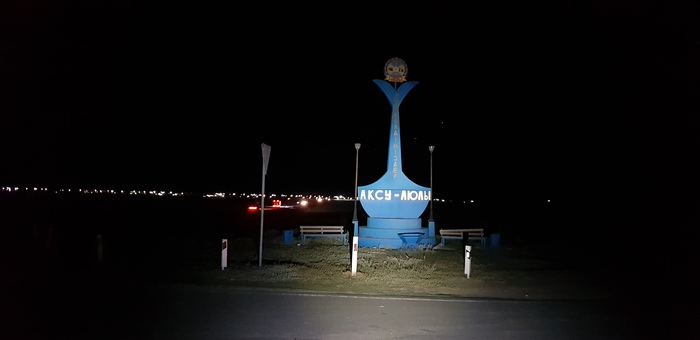 Далее будет мало фото, когда едешь один, больше сосредотачиваешься на дороге. Сегодня поставил цель достичь некоего села Аксу-аюлы, это еще 100 км, а на дворе 17:00, придется пилить по темноте… Еще как на зло за 9 дней поездки случился первый прокол, глядя на заходящее солнце сменил покрышку за 7 минут (специально засек) и укатил в закат…