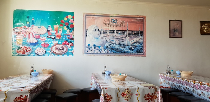 На обед остановился в придорожном кафе около села Спасск. Внутри оказалось пусто, что не могло не радовать, только в одной комнатке заметил чувака читающего намаз, не стал его отвлекать своими чревоугодными расспросами, дождался когда он закончит и заказал окрошку, салат и лагман с только что испеченной ароматной лепешкой, ммм…