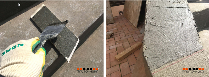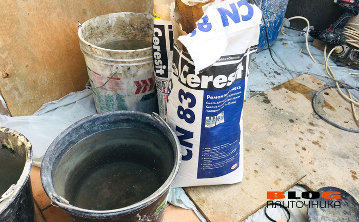 Далее был нанесён адгезивный состав (подробнее о нём ниже ), благодаря ему адгезия ремонтной смеси к основания возрастает в несколько раз. Что входит состав этой смеси и рецепт её приготовления выложу в конце этого блока: