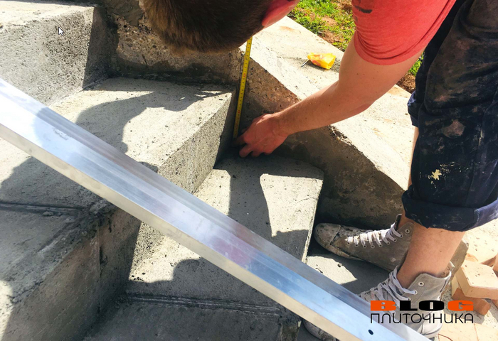 Маяки выставлялись с помощью уровней. В процессе внимательно следили за тем, чтобы высота ступеней максимально одинаковой (где-то была разница в 5мм, но это не 2-3 см, как было изначально).