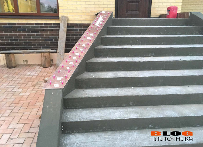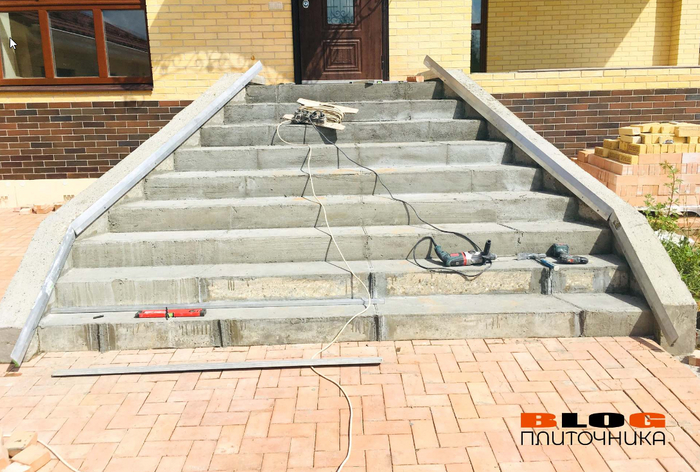 Имеем бетонную лестницу (крыльцо), которое необходимо облицевать клинкерной плиткой. Задача существенно усложнялась тем, что при заливке лестницы была нарушена геометрия: разность высоты ступеней, разные "борта" по ширине и т.д и т.п. Я уже не говорю про соблюдение плоскости и уровня (вертикаль/горизонталь).