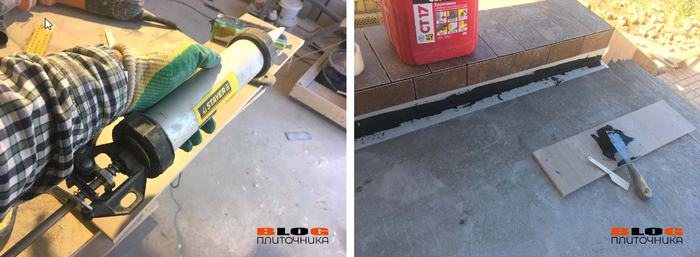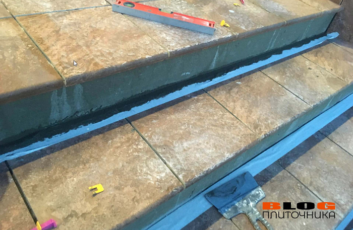 Прежде чем заполнить шов — плитку края плитки обклеил малярным скотчем.