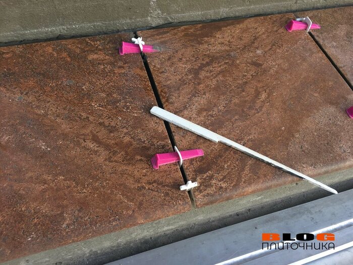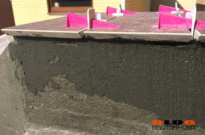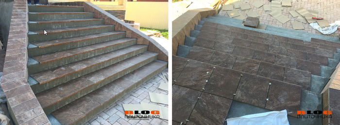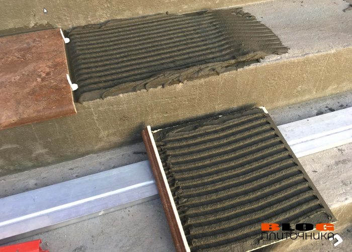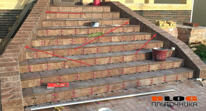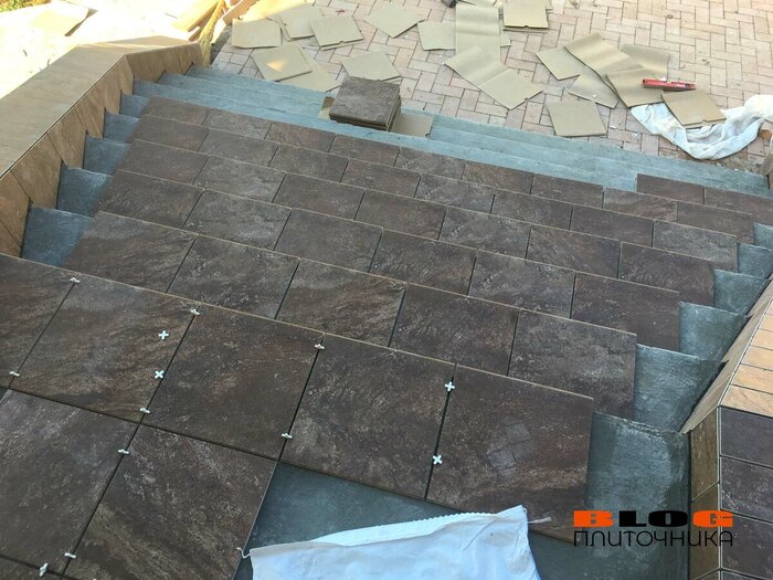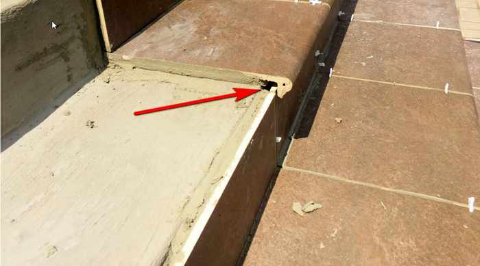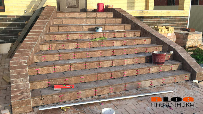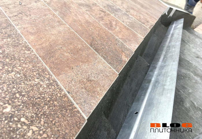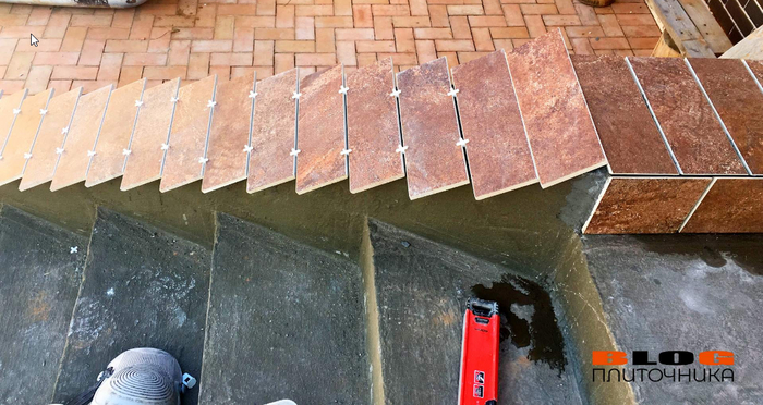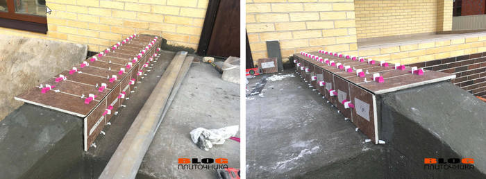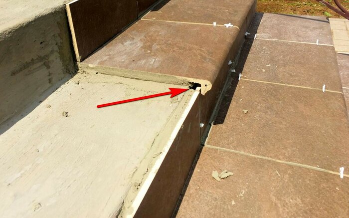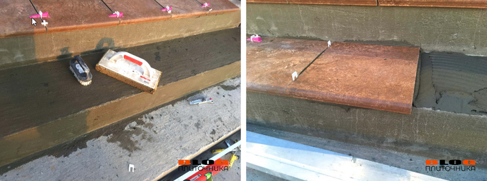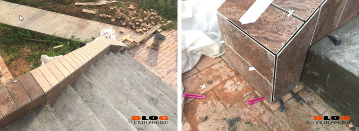 Всё-таки было бы правильнее укладывать в начале горизонтальные площадки и только потом вертикальные. Да, из-за этого пришлось бы серьёзно повозиться с резкой и шлифовкой примыкания вертикальной плитки к ступеням (точно и скрупулёзно повторить форму капиноса), но так было бы правильнее.