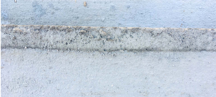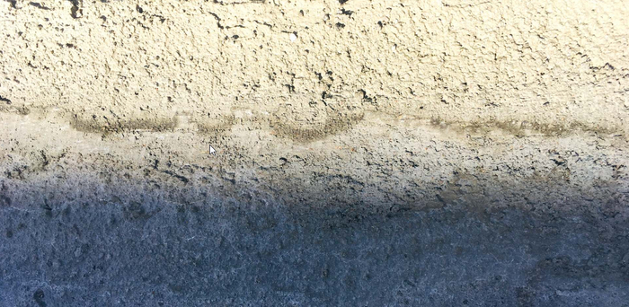 На следующий день внимательно проверили качество сцепки смеси с бетоном на предмет трещин. Вот здесь хорошо видно, что при использовании адгезива + метода промазывания насдир качество склейки очень хорошее. Нигде даже микротрещин не было: