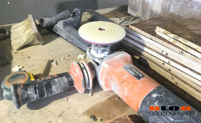 Замывал стандартным набором плиточника: ведро для мытья затирки, специальные губки — тёрки (они как раз для работы с ведром — значительно ускоряют процесс мытья),