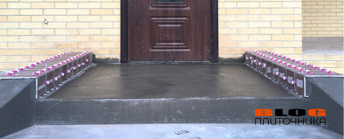 На следующий день приступили к выравниванию площадки крыльца и горизонтальный плоскостей ступеней.