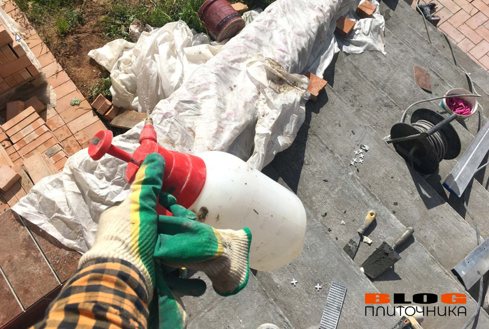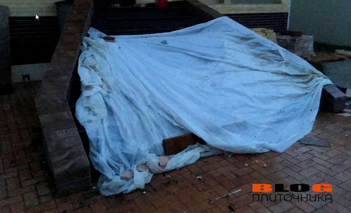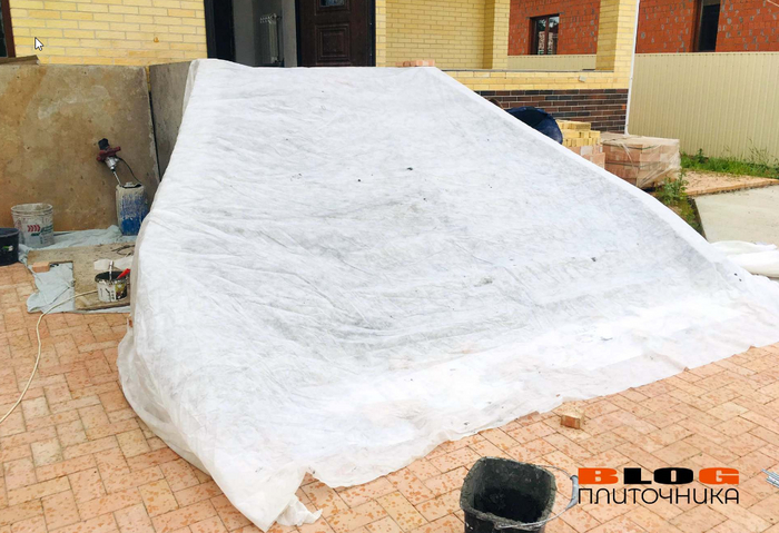 Поскольку на улице стояла довольно жаркая погода — раствор постоянно укрывали.