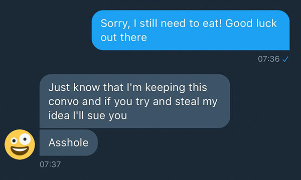 -Просто знай, что я сохраню этот диалог и если ты попытаешься украсть мою идею, я тебя засужу.
