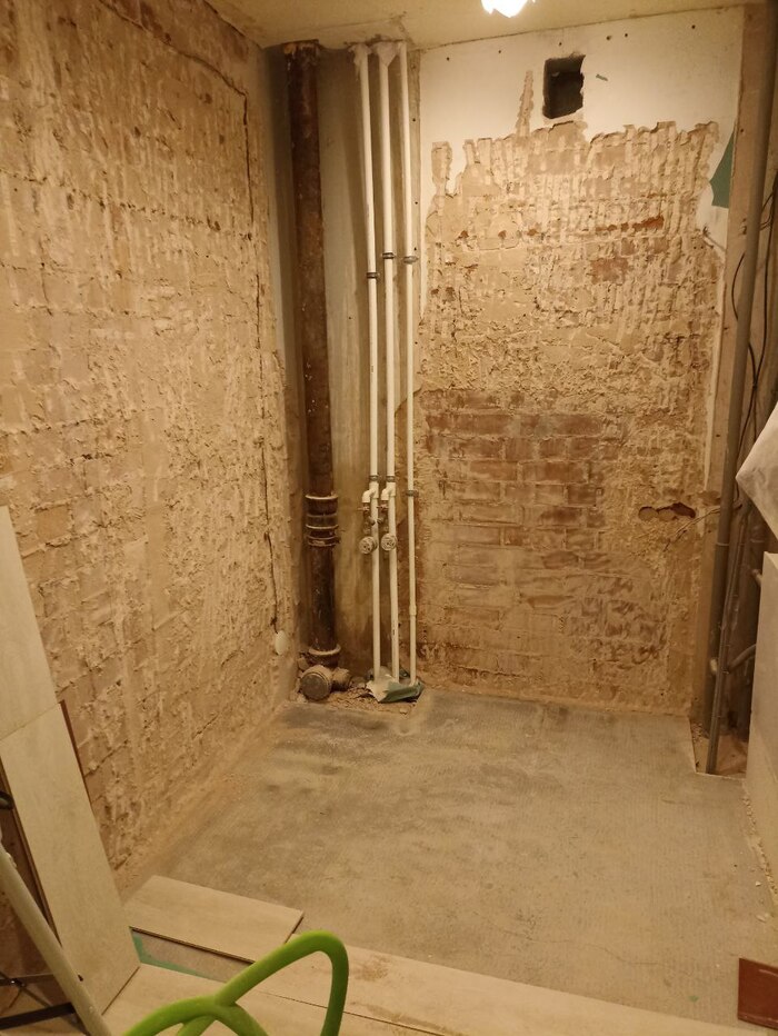 Мною было решено сносить всю штукатурку до кирпича по всему этому коридорчику, где должен быть туалет. С этим я относительно успешно справился, хотя здесь все равно присутствует некоторое сомнение. Штукатурка отваливалась легко, так как она была насквозь мокрая, а толщина её была с 3 пальца, не ясно куда её столько было
