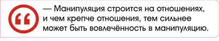 — Манипуляция не всегда бывает осознанной. Порой, когда человек говорит «Не уходи, мне так грустно без тебя», он просто высказывает свою эмоцию. Это скорее коммуникативный, позволяющий более эффективно общаться приём, нежели манипуляция. Тем не менее если подобные фразы звучат постоянно, то стоит задуматься. Да, манипуляция тоже позволяет общаться эффективно, однако эффективность в этом случае подразумевает исключительно одностороннюю выгоду. Манипулятор центрируется на собственных потребностях и своими высказываниями стремится сделать так, чтобы другие эти потребности удовлетворяли.