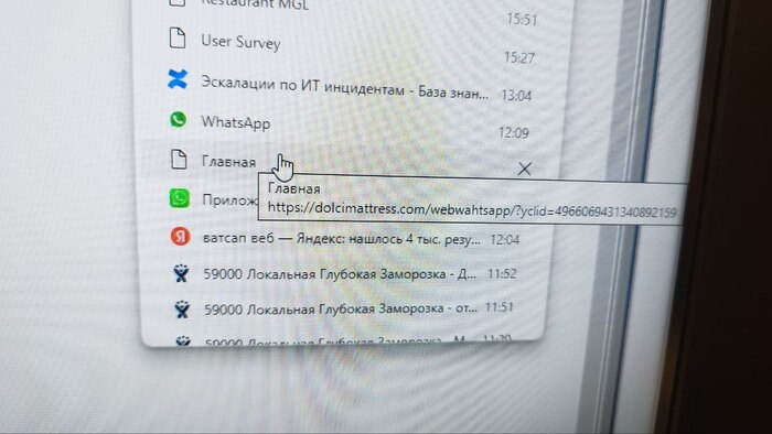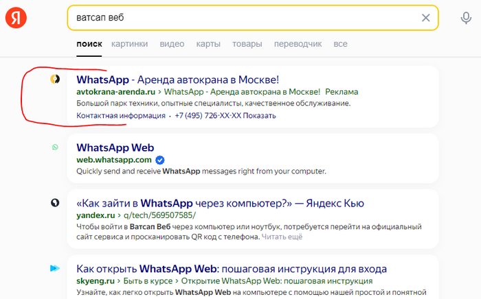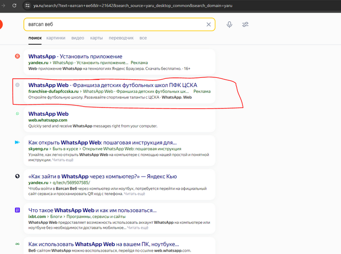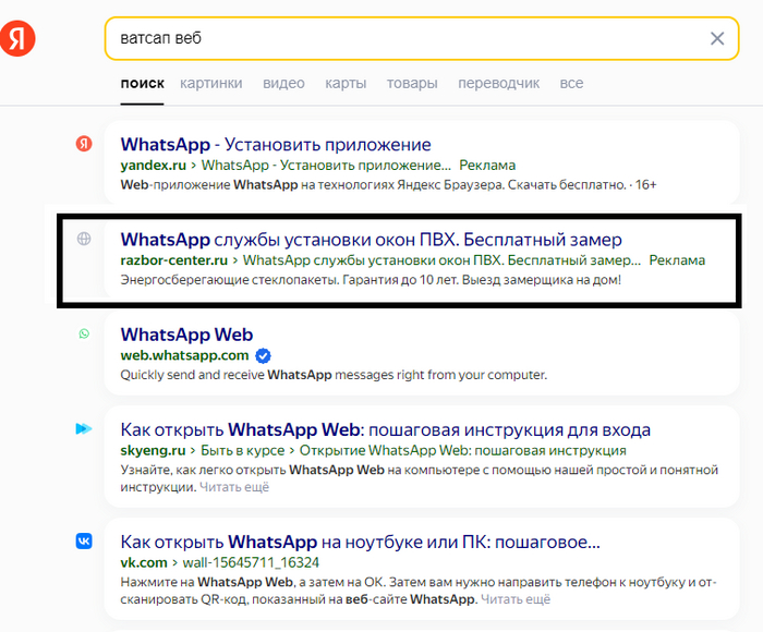 Я расспросил жену о подробностях, и она рассказала, что открыла браузер и ввела в поиске «ватсап веб», после чего перешла по третьей ссылке. Я попросил её зайти на работу и в Истории браузера найти эти страницы, не нажимая, а просто навести курсор мыши и сфотографировать ссылку. В одной из ссылок я увидел проблему и понял, как телефон был взломан.