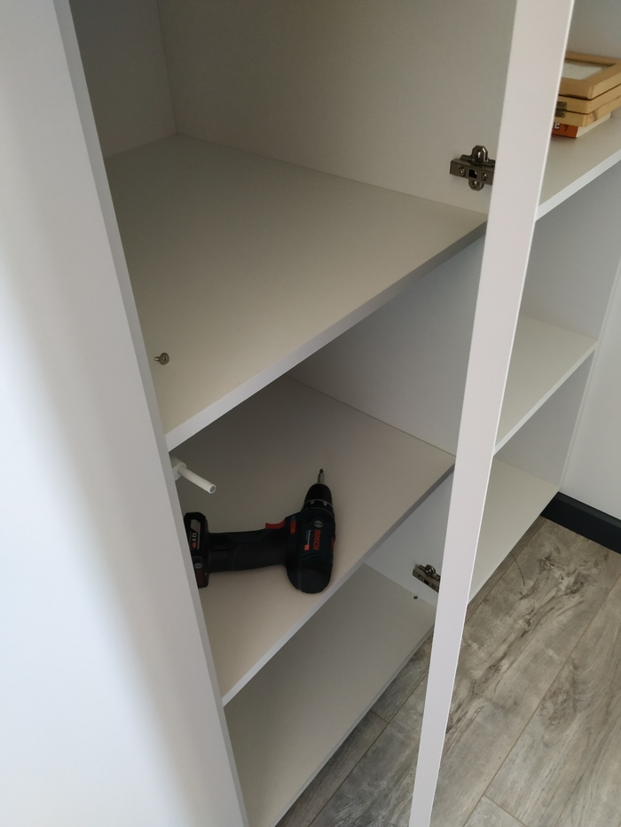 Что ещё... Ну если у вашего шкафа видимая боковина то обязательно полки ставить на стяжки типо этой