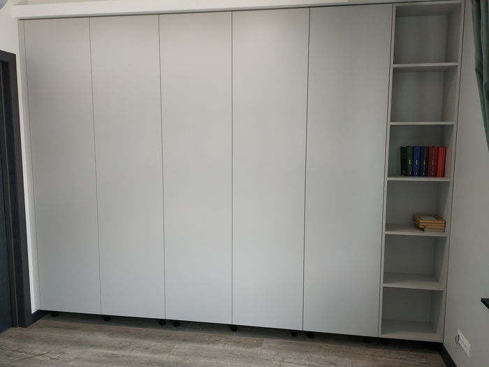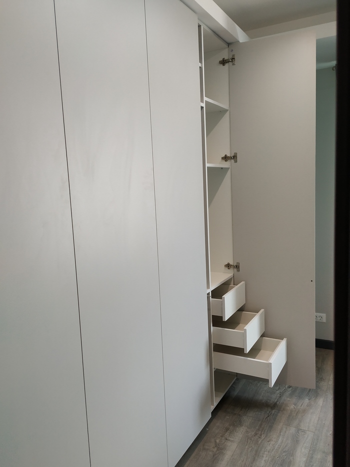 Размеры плиты 2800х2080 конечно ее нужно распилить, цена на распил и поклейку кромки зависят от конторы в среднем выйдет 10₽ за п.м распила, кромка ABS что-то между 32-65₽ зависит от толщины (0.5мм/ 2мм) и производителя. На данный шкаф ушло