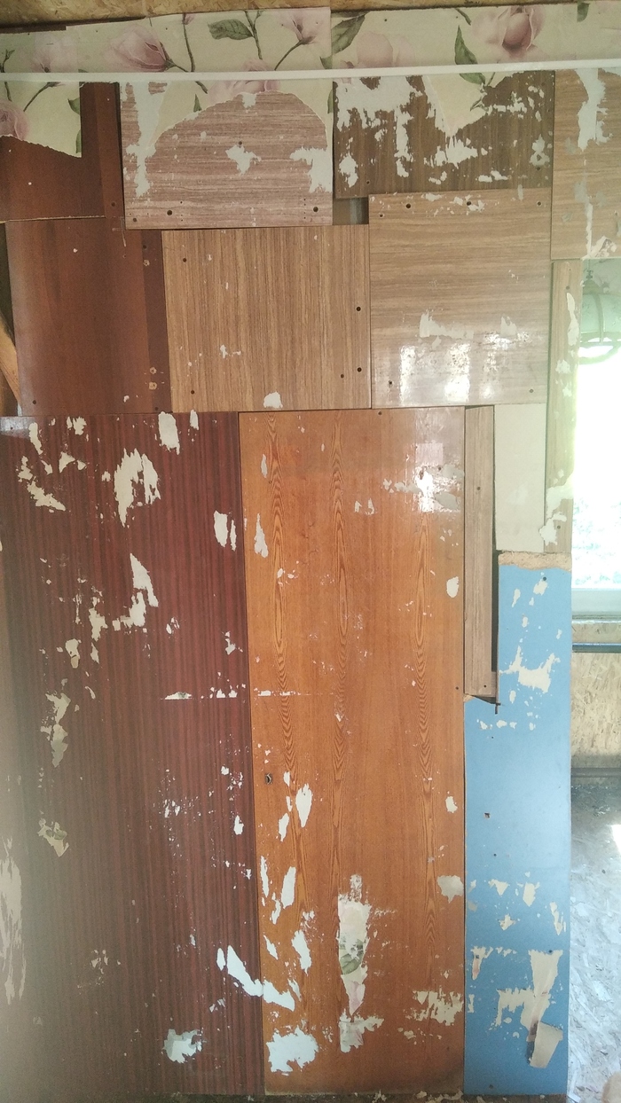 Межкомнатная стена обшитая шкафами с помойки.такими крахоборами были бывшие хозяева нашего жилища