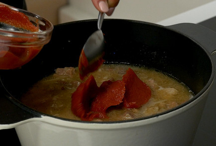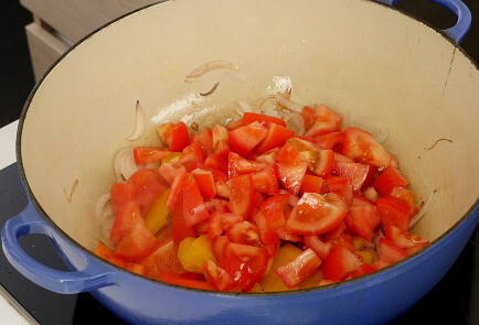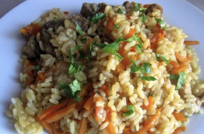 7 Вскипятить чайник. Обжаренные овощи и мясо залить кипятком (вода должна покрывать мясо с овощами где-то на 2 см). Посолить, поперчить, добавить специи для плова. Варить на среднем огне 20 минут.