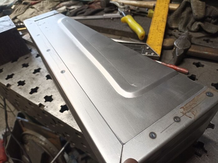 Ах, да. Надо же ещё лоток под абразив и банку для воды! Ага. Порезал лист чернухи на гильотине, согнул на самодельном магнитном листогибе, прокатал на самодельной зиговке