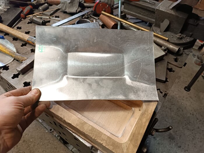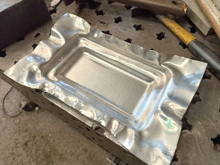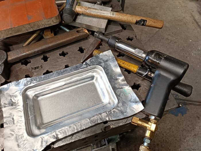 В принципе, сам лоток уже готов. Но опять же, края надо оформить. Если прямо так сунуть в гильотину или ножницы - получится плохо. Рез будет неровный, возможен наклёп и т.д. из-за мятых фрагментов. Поэтому беру авиационный пневмомолоток и несколько рихтую.