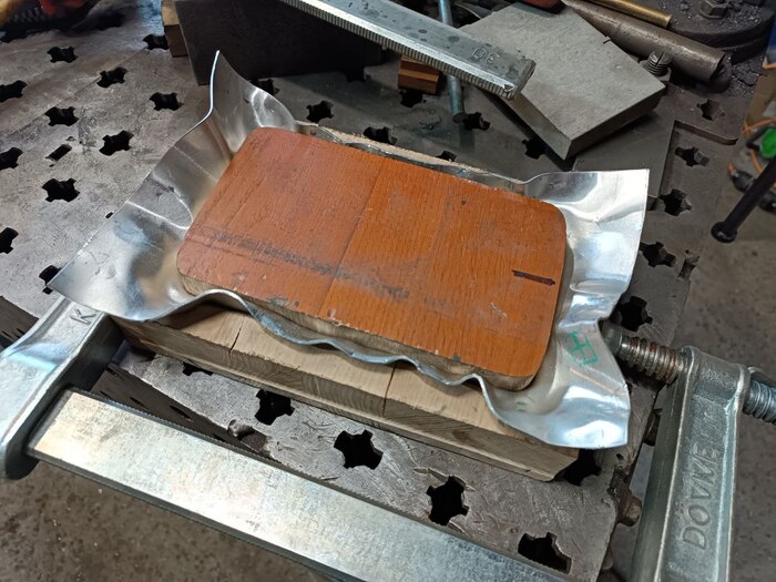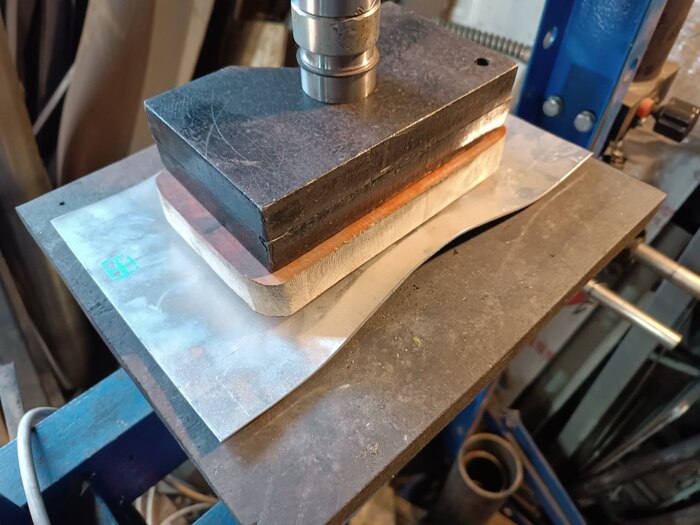 Но сразу прессовать не получится, т.к. матрица и пуансон никак не связаны между собой направляющими и попасть одним в другое нереально. Поэтому сперва оформляю "заход", легонько даванув пуансоном материал, уложенный на резиновую плиту.