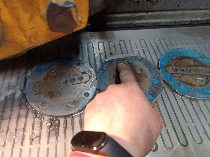 Клапанные доски по заводу весьма причудливы геометрией. Т.е. вон я пальцем показываю, где уже начался съём - это наивысшая точка из трёх досок. Остальное - провалено вниз.