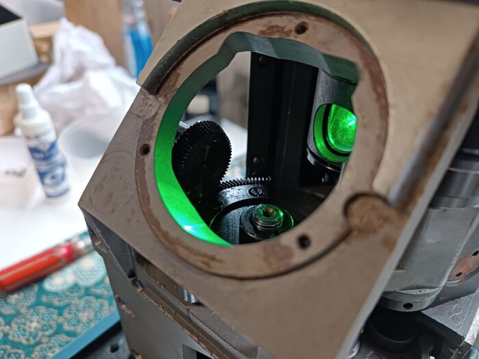 Штош. Чуток САПРа, тридэпринтор и сделана новая. Роскошно. Впрочем, несмотря на то, что всё аккуратненько собрал назад, микроскоп показывает ну... что-то.