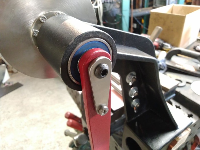 Чтобы нижний (длинный) ригель ходил как надо и не блямкал, применена промежуточная опора из капролона: