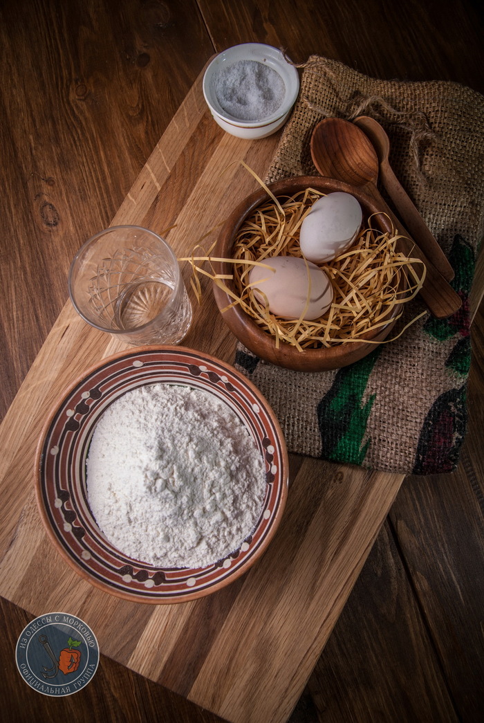 - В миску всыпьте 225г муки, добавьте соль, перемешайте и сделайте внутри колодец, небольшую выемку, в которую вбейте 2 яйца. Разболтайте их вилкой или небольшой деревянной ложкой.(большой ложкой или лопаткой будет неудобно). Постепенно захватывайте вилкой края муки и смешивайте вместе яйца и муку. На этом этапе добавьте воду. Когда вся мука будет смешана с яйцами и водой, уберите вилку и месите тесто уже руками. На такое количество хватит и 5 минут. Тесто должно быть более-менее однородным, не липнуть к рукам и не рассыпаться. Но поскольку продукты бывают разными, то и результат может разнИться. Если после указанного времени вымешивания тесто липнет к рукам- добавьте немного муки. Если крошится, то вместо воды я предпочитаю еще немного вымесить- после раскатки тесто все равно станет как надо.