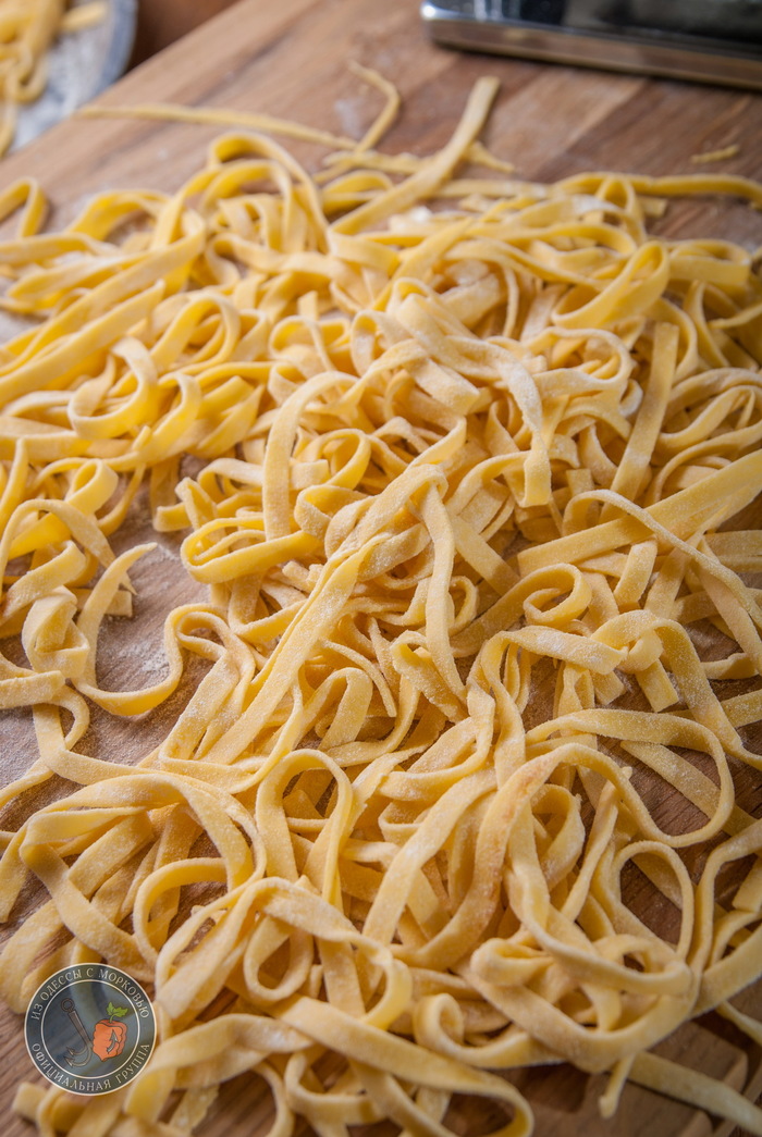 - Нарезанную лапшу слегка припылить мукой и разложить в один слой на доске или противне.