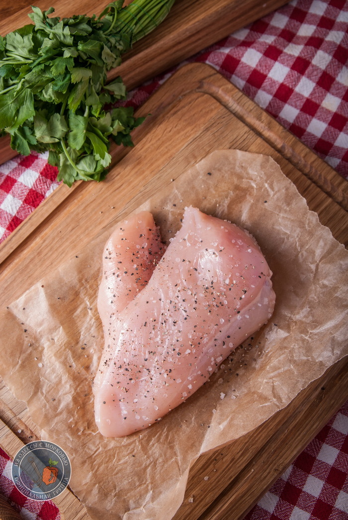 - 1 куриное филе. Берите среднее по размеру, такое, чтобы грамм 400 завешивало.