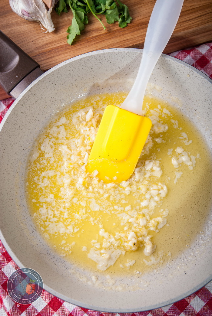 - В сковороде разогреть оставшиеся 50г масла на небольшом огне. Добавить чеснок и готовить секунд 20-30. Приправить солью и перцем.