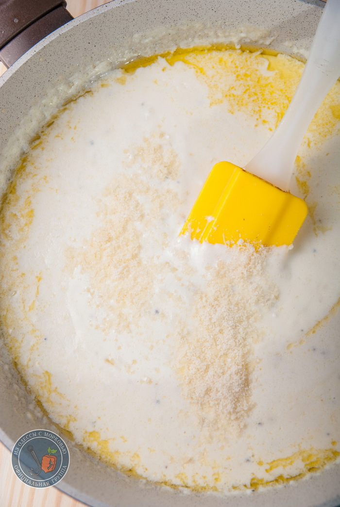 - Добавить муку и хорошо размешать, чтобы не было комков. Аккуратно влить сливки. Довести до кипения и выключить. Такой соус кипеть не должен. Вмешать натертый на мелкую терку пармезан (или что там у вас) и перемешать.