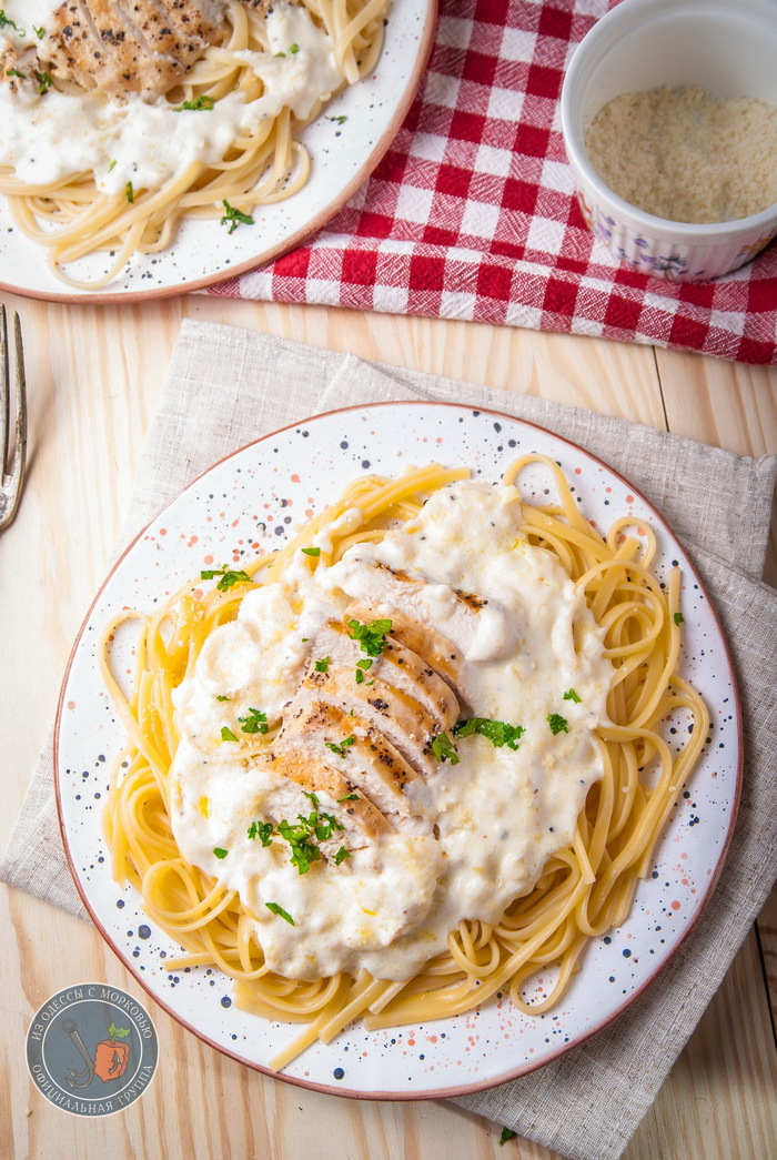 Я обычно кладу на тарелку сваренную пасту, добавляю сверху кусочки куриного филе и поливаю соусом. В конце хорошо посыпать сверху тертым пармезаном и рубленой петрушкой.