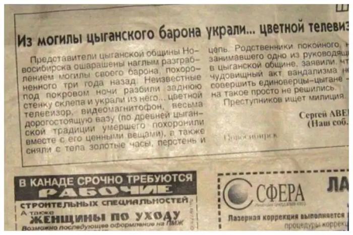 На кладбище… знаете, есть такой фильм: Война миров Z. Там тысячи зомби, пытаясь перелезть через стену в Израиле, издают многотысчно-децибельный звук. Вот примерно то же происходит и на кладбище. Чем ближе покойный Януш к дыре в земле, тем громче орут и визжат долбанные цыгане. Бабы даже могут начать прыгать в могилу, из которой их потом старательно, с понимающими взглядами, достают мужики. Как уже было сказано, после необходимой церемонии воя и плача всю могилу устилают коврами, ставят гроб с подгулявшим цыганом, накрывают его сверху еще одним слоем ковров, а потом начинают сыпать в могилу бабло, исключительно бумажное. Чем богаче семья, тем крупнее купюры. Сыплют, пока песок не поравняется с землей, а затем, наконец, дают ритуальщикам с трясущимися руками водрузить над могилкой холм. Представляю, как через лет восемьсот охуевшие археологи отроют эти квартиры с костями и бритвами от «джилет».