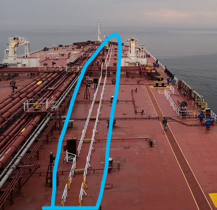 На фото ниже, этот самый Cat Walk обведен голубым цветом. По краям палубы видно белые леера. Они огораживают палубу, чтобы человек случайно не шагнул за борт, а так же, являются последней надеждой на спасение, если его смывает за борт. Леерное ограждение есть везде - по краю палубы, на различных высоких площадках, на трапах, и т.д. Опять же, на фото его видно в разных местах.