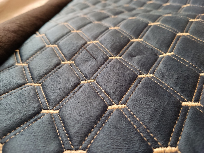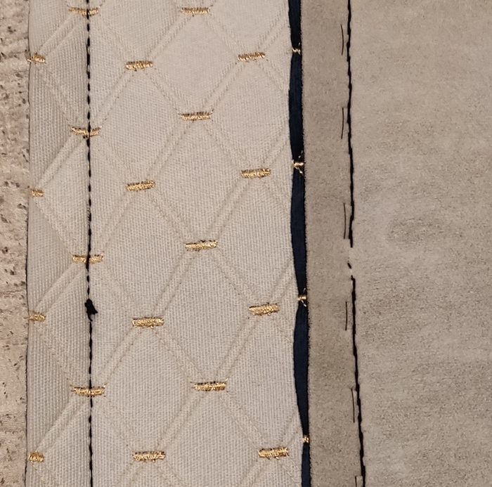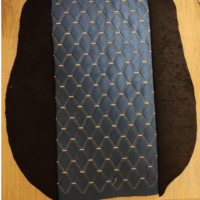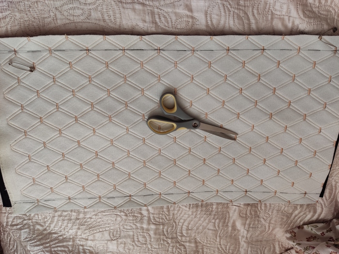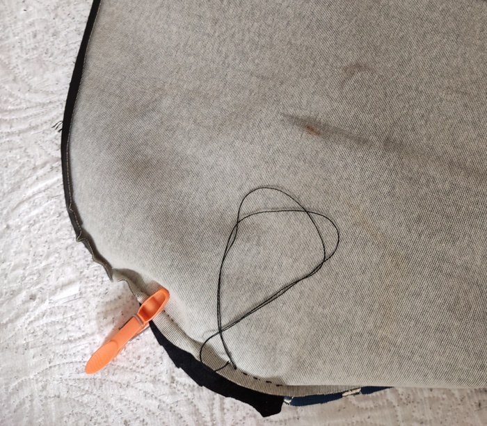 По шву и периметру пришил бегущей нитью к постиранным кускам от старой обтяжки и отрезал лишнее