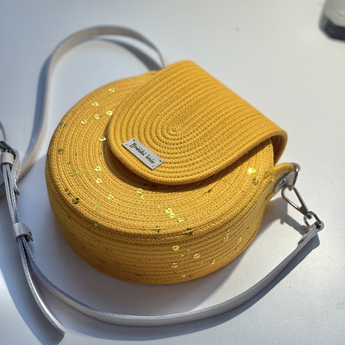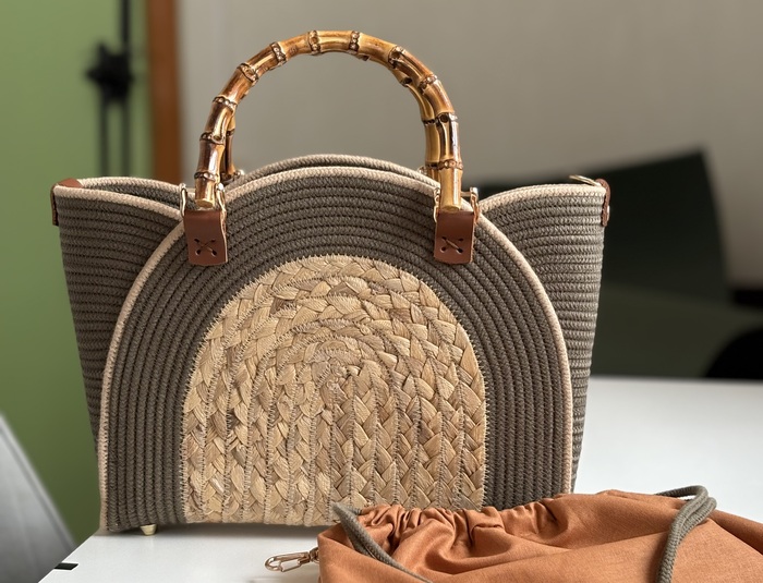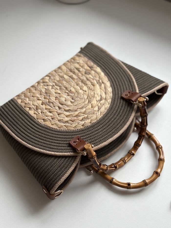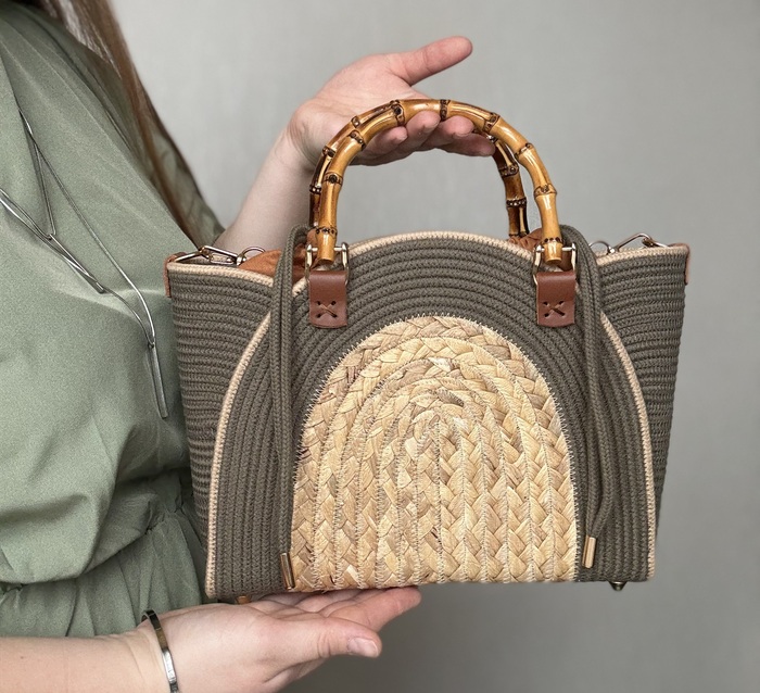 Травяная коса, хб шнур, бамбуковые ручки, кожа, хб ткань на подклад