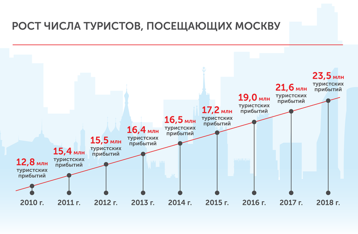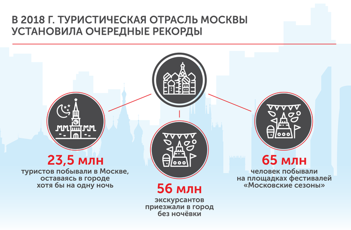 23,5 млн туристов побывали в Москве, оставаясь в городе хотя бы на одну ночь;56 млн экскурсантов приезжали в город без ночёвки;65 млн человек побывали на площадках фестивалей «Московские сезоны».