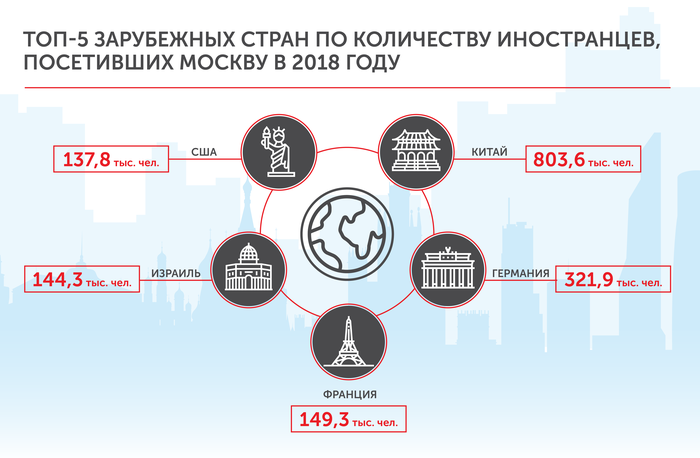 Иностранцев приезжает тоже немало – 5,5 млн человек, в том числе 2,1 млн жителей стран СНГ и 3,4 млн граждан дальнего зарубежья. Из дальнего зарубежья чаще всего в Москву едут граждане Китая, Германии, Франции, Израиля и США.
