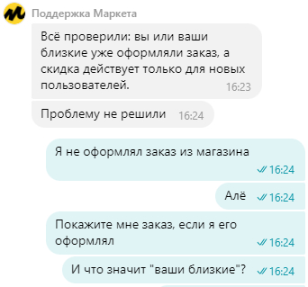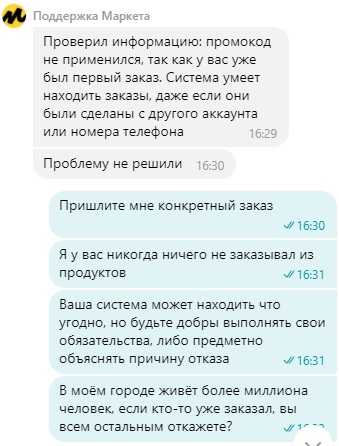 Но как же так? Это мой первый заказ у данного агрегатора в разделе "продукты" (честно-честно, никогда этой помойкой ранее не пользовался для заказа продуктов, даже в мыслях не было). По срокам всё соблюдено, может сумма больше 3к смутила? Уменьшил сумму - лучше не стало. Пишу в поддержку. Надеюсь на адекватный ответ (ха-ха, наивный). Получаю вот такие комментарии: