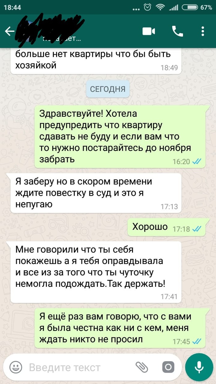 И чего надо было ждать то? Мы от нее так и не добились. Добились только одного, что она думала что дверь будем ставить за ее счет и что деньги мы берем за октябрь месяц, а не за ноябрь. Но что изменилось, когда мы ей пытались это объяснить? Ничего..