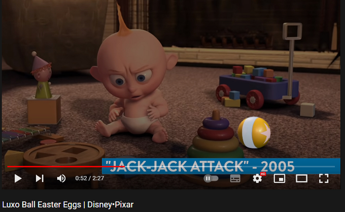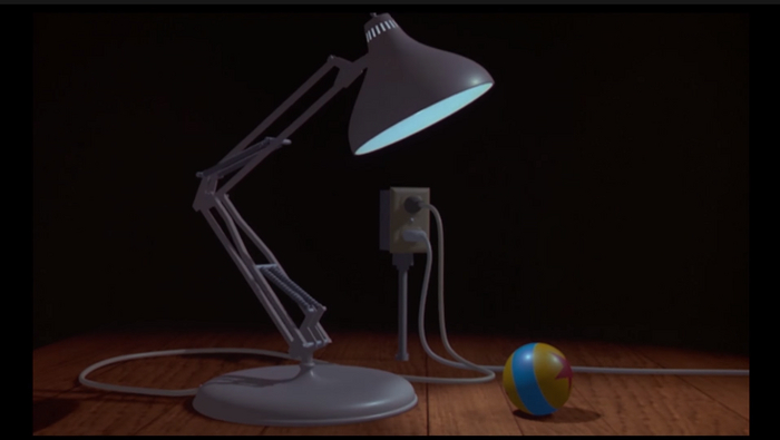 Там упоминается короткометражный мультфильм Luxo, Jr., который в своё время (1986 г.) произвёл настоящий фурор и позволил Пиксарам стать известными и выйти из кризиса. В нём представлена небольшая сценка с участием двух настольных ламп (одна из этих ламп впоследствии перекочевала в логотип Pixar). Собственно, вот он: