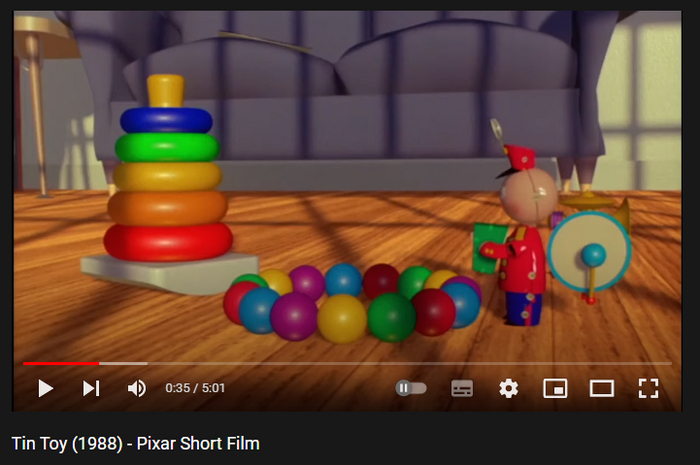 В том же моменте с полётом Базза Лайтера мелькает подозрительно знакомая игрушечная пирамида. В той статье про Pixar упоминался их же короткий мульт Tin Toy (1989), я его посмотрел ранее, поэтому зрительно он у меня отложился в памяти. Так вот, в "Историю игрушек" эта пирамида перекочевала из него)