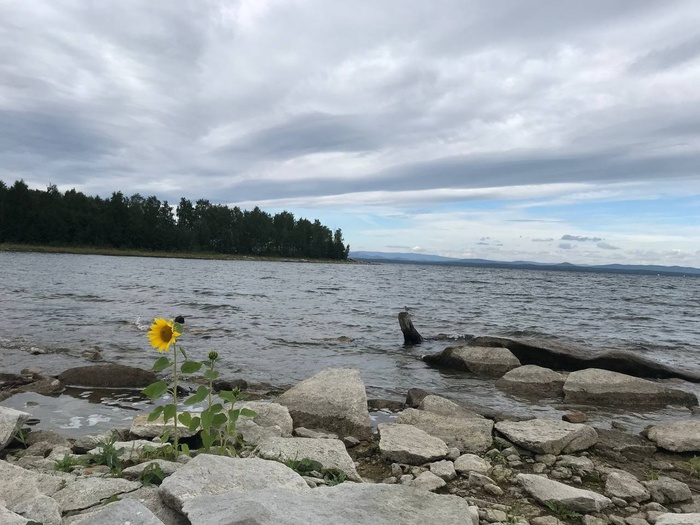 Мысли о работе и обо всём на свете давно уже в прошлом, ты просто едешь по дороге, с крейсерской скоростью (она, кстати, была увеличена до 18), и ни о чём не думаешь, это прекрасные ощущения… нас снова встретила дорога из земли, с лужами, с озером по пути и озером в конце дня, где было очень много лагерей и баз отдыха, новое для меня озеро, Увильды, оно было таким широким, прозрачным и каменистым, что это вызывало огромный восторг, не хотелось уезжать… (мы так ни разу утром и не уехали, в основном, время выезда близилось к 12, иногда в 3 дня, ехали с прекрасным чувством, что мы никуда не спешим). Прогулка по просёлочной дороге пешком с Юлей до магазина, музыка на стоянке наша любимая (конечно же это не так, но вечером все уехали, так как это было воскресенье). Подсолнухи, растущие из земли, из камня…